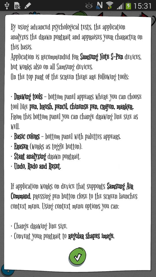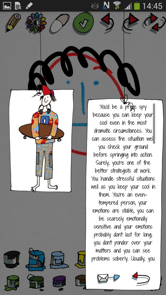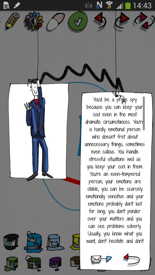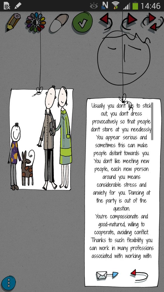 By using advanced psychological tests, the application analyzes the drawn portrait and appraises your character on this basis. And all of this comes in an entertaining form, thanks to funny and colorful graphics.