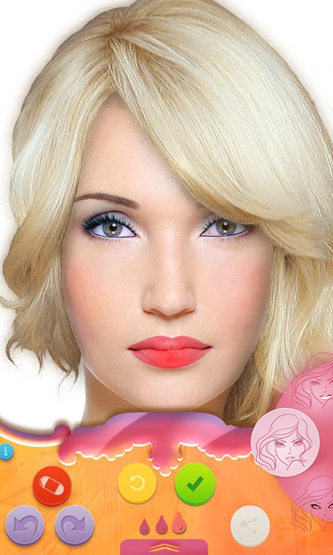 To start new makeup just take a photo using camera, choose photo from gallery or choose supermodel beautiful photo from application's library and start preparing your new look. Next just use your fingers or device's pen to draw professional looking makeup. Application is smart and helps you to draw - thanks to this feature your lips contour, eye lines will be always on place, lipstick and gloss will be perfectly applied on the lips, eyeshadows will be smooth and beautiful etc. Undo, redo and eraser options are available if you want to correct you makeup.